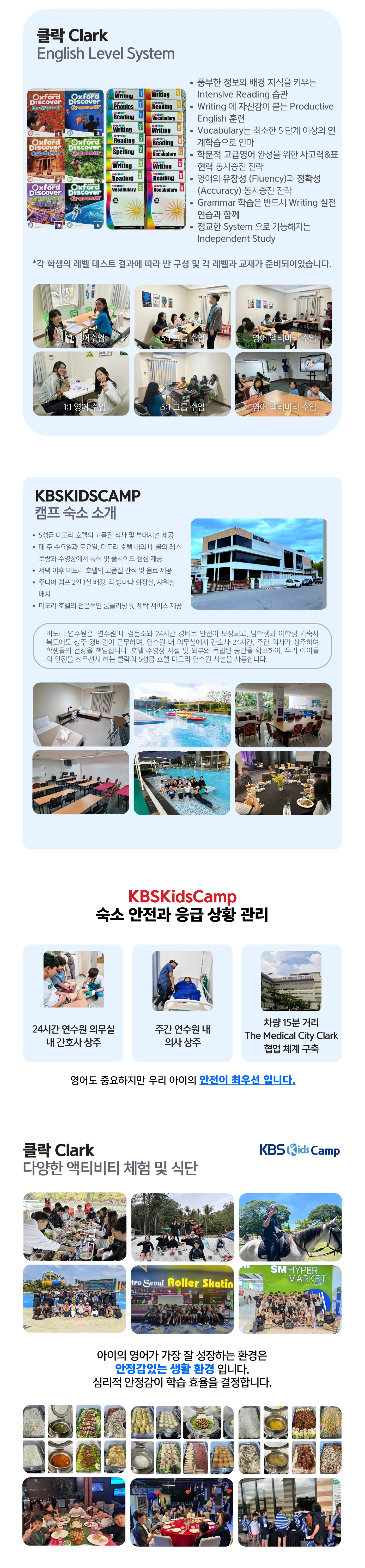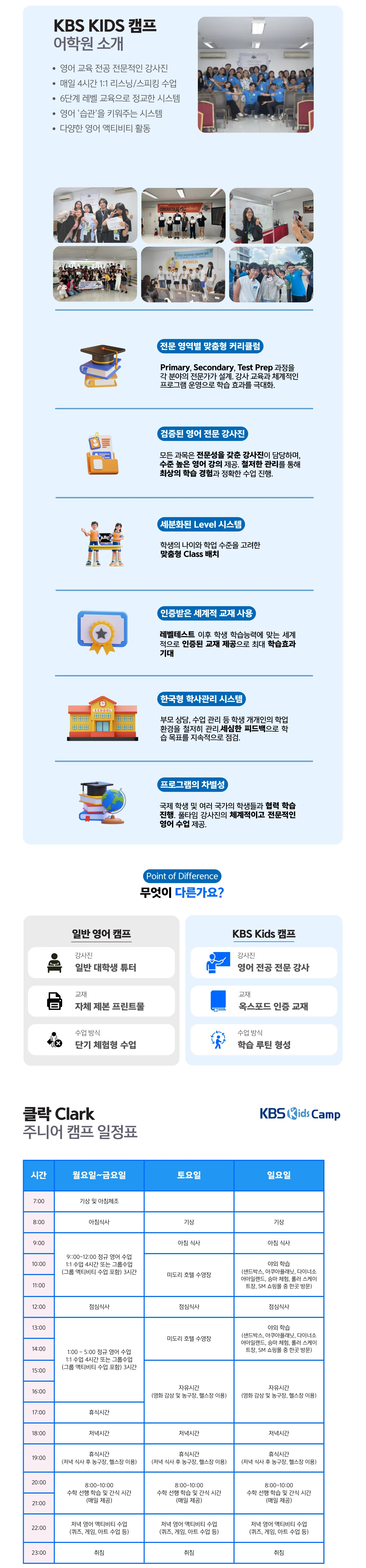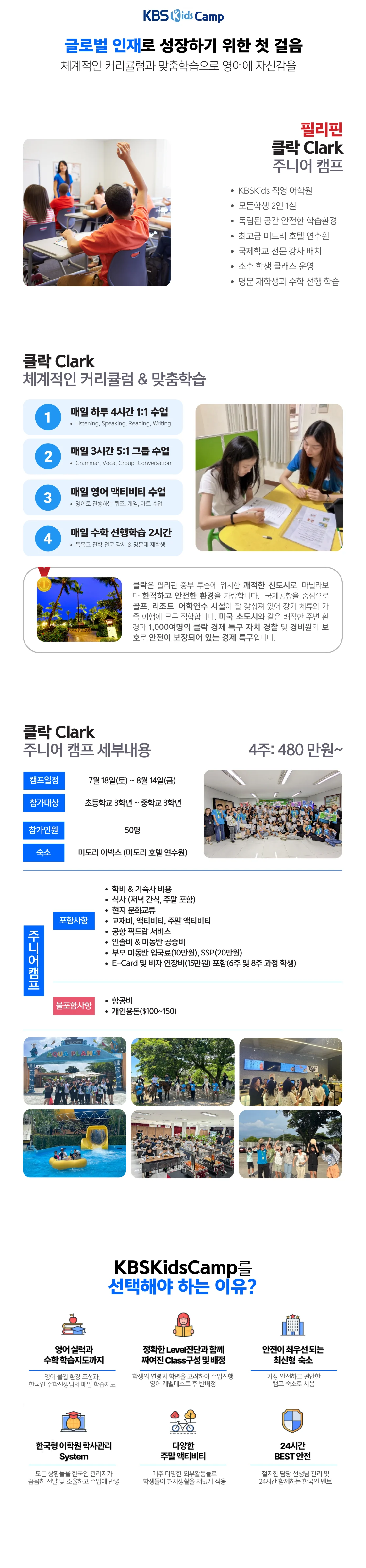 KBSKids캠프 필리핀클락 캠퍼스 참가인원주니어 캠프 50명참가대상초등 3학년 ~ 중학교 3학년숙소미도리 아넥스 (미도리호텔 연수원)학비480만 원(4주)캠프일정2026년 07월 18일(토) ~ 08월14일(금)전화 상담1551-0174 상담 문의하기 카카오톡 상담하기
